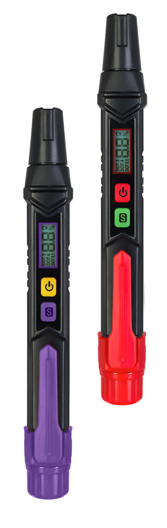 The operating principle of the tester is based on measuring the conductivity of the liquid. The tester probe is placed in the brake fluid; by default, it operates in DOT 3 mode, and with a button press it can be switched to DOT 4 or DOT 5.1 mode. The device will take a measurement in a few seconds: The percentage of moisture will appear on the screen, and the display will turn green, yellow, or red. A value in the range of 0–2% and a green screen indicate that everything is fine. For a value of 2–3%, a yellow screen and a buzzer sound indicate a recommendation to change the brake fluid. With a reading of 4%, a red screen and a rapid beeping sound means the brake fluid needs to be replaced immediately.