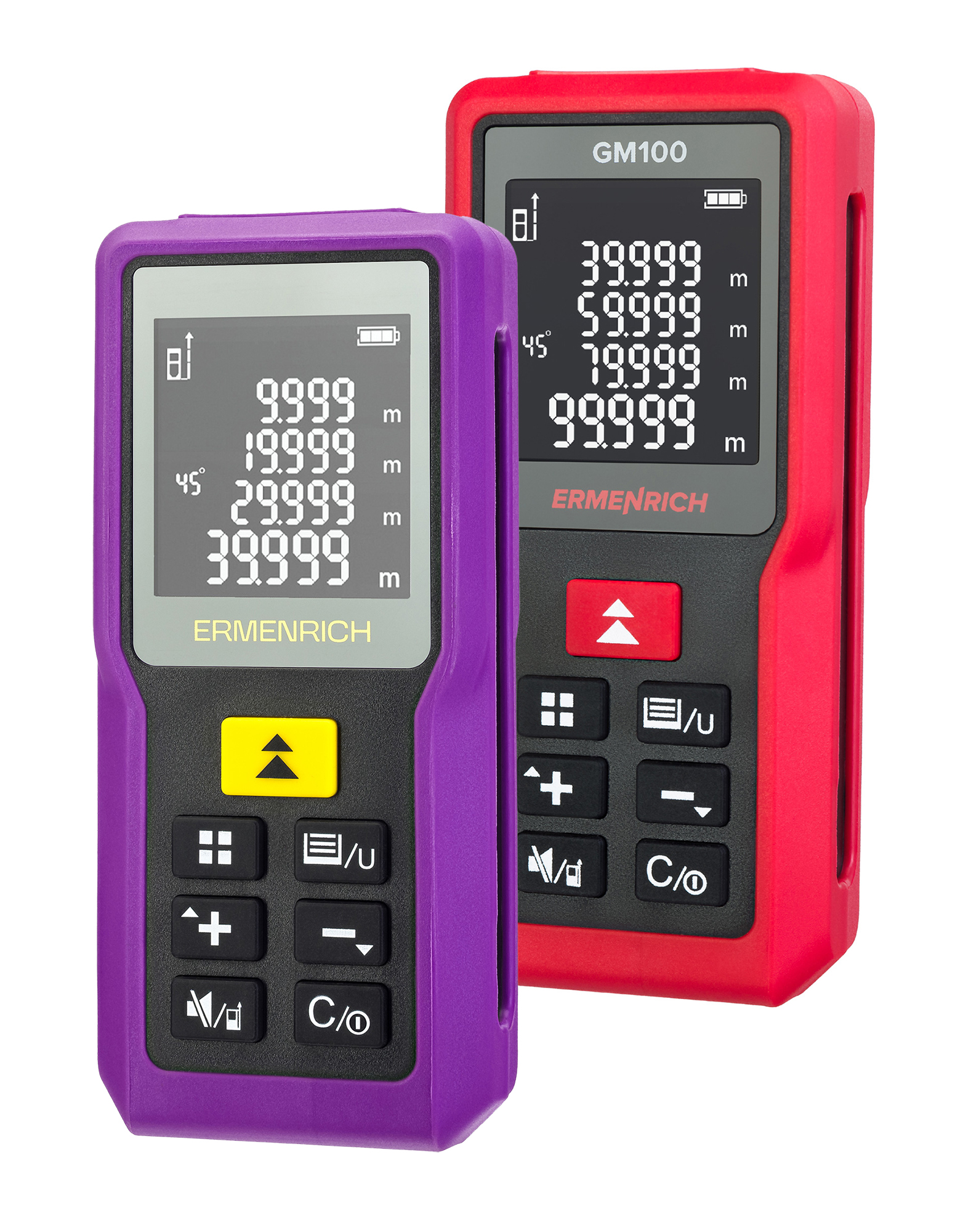The Ermenrich Reel PRO GM100 is a laser meter designed for measurements at construction and renovation sites. It can also be used for land boundary surveys, land surveying works, and other applications that require the precise measurement of the linear dimensions of an object, its area, and volume. The maximum measuring distance is 100 meters (328ft). The laser meter can also serve as a laser angle meter. Thanks to the Pythagorean theorem feature, it automatically calculates distances after taking intermediate measurements. This function is particularly helpful if you cannot position the laser in such a way to directly draw the beam from point to point.