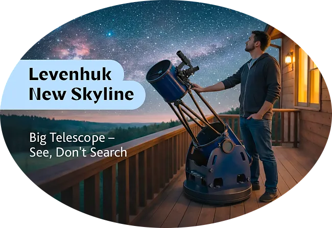 Levenhuk New Skyline PLUS Newtonian reflector telescopes are an excellent choice for beginners and amateur astronomers who are seeking a powerful and versatile instrument. These telescopes stand out thanks to their finely calibrated optical design and high-quality materials. They reveal detailed views of the Solar System and breathtaking images of deep space. Featuring BK-7 glass optics, high-reflectivity aluminum coatings, and a parabolic primary mirror, the optical design ensures sharp, evenly illuminated images with natural color rendition, even when observing faint objects. Levenhuk New Skyline PLUS telescopes come with stable Dobsonian mounts and essential accessories. Therefore, you can start observing right out of the box.