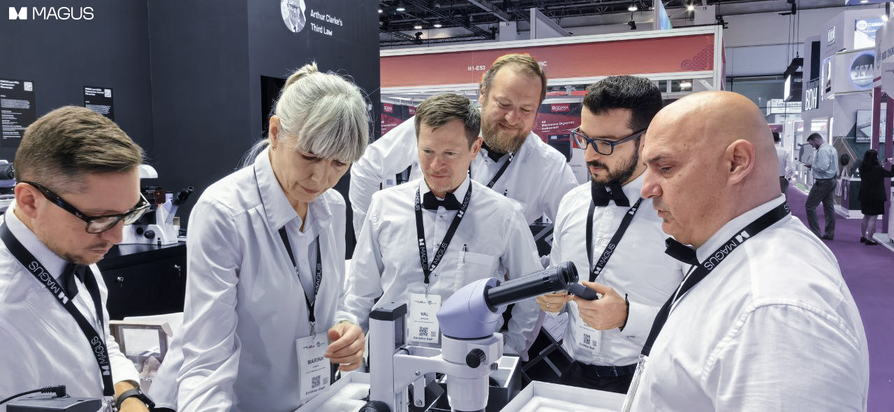 Over the three days of the exhibition, the MAGUS booth welcomed over 5,500 specialists. They explored our product range, conducted test drives, and asked our experts their questions. Many visitors came with their own samples for research, already aware of the company’s high level of expertise and its ability to solve complex analytical challenges. MAGUS microscopes were used to examine a wide variety of materials, including brilliant cut diamonds, rough diamonds, oil, textiles, and a thin petrographic section of a real meteorite provided by our team. This fully demonstrated the versatility and reliability of our equipment.